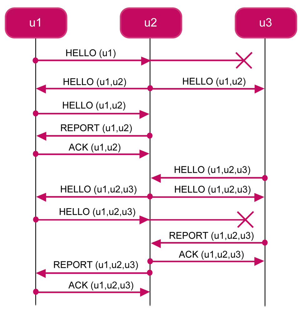 ACK(u1,u2). The node u3 adds to the message its identifier and information about link quality. Then it broadcasts HELLO(u1,u2,u3). Upon receiving this message, the node u2 re-broadcasts it. The message is received both by the GW u1 and the node u3. Upon receiving the message, the node u3 builds a report message
