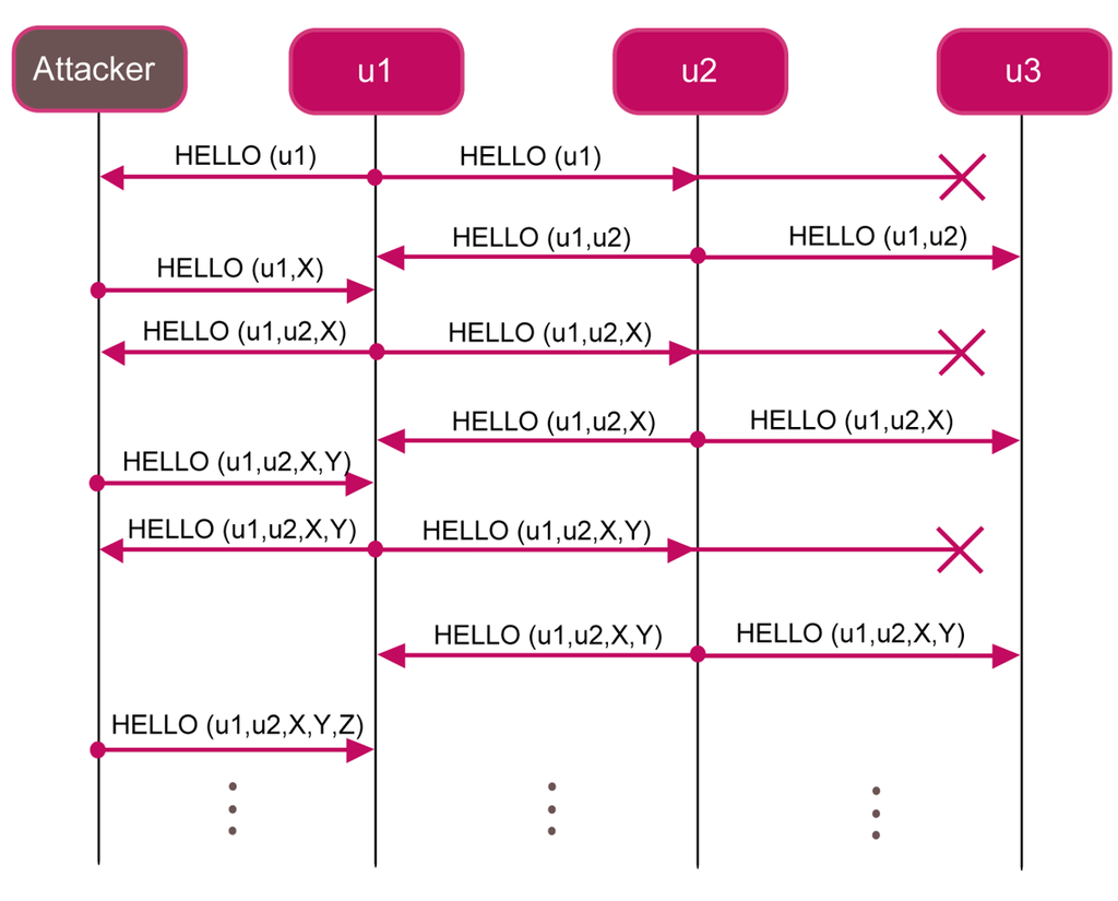 In this way, the protocol never completes. In order to avoid this kind of attack, each node could be deployed with the list of all the nodes identifiers belonging to the system. Thus, if the attacker tries to add a new fake node to the network, each node rejects it, because the fake node is not contained in that list. However, due to the underwater conditions and to the high distances among nodes, it may happen that a node u1 is not able to directly contact nodes u2 and u3 belonging to the system. The attacker could exploit this situation in order to use u2 and u3 identifier to perform a DoS attack.