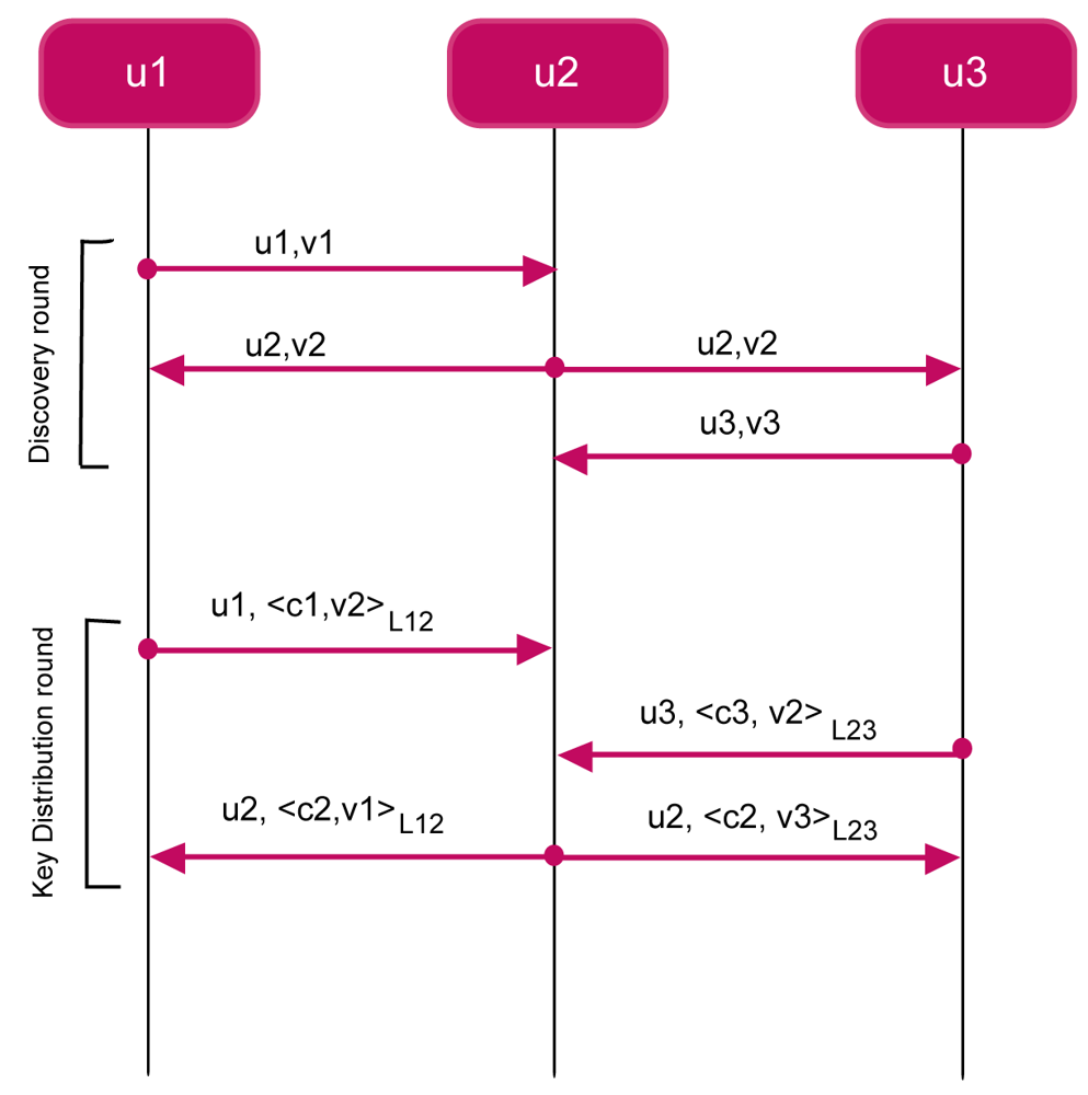 The protocol is composed of two rounds, the discovery round and the key distribution round. In the discovery round, a node u generates a fresh quantity νu and broadcasts it together with its identifier u (message M6.3). Upon receiving message M6.3, a node υ replies u with its identifier υ, its cluster key cv, and the fresh quantity νu (message M6.3). The message is protected by means of the link key ℓuv. Upon successfully receiving message M6.3 from υ (otherwise, the message is discarded), node u stores the received cluster key cv into its CKT