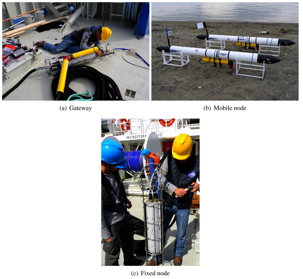 Figure 8 shows the topology of the underwater acoustic network, which constituted the testbed during the experiments. It is composed of a gateway GW, two fixed nodes (FN1 and FN2) and two UAVs (FLG1 and FLG2). Figure 9 shows the real devices we used in the experiments. Notice that the gateway (Figure 9(a)) is equal to a fixed node (Figure 9(c)) except for the optical fiber that connect the device to the asset (blue cable). UAVs are of Folaga type, manufactured by GraalTech Inc. [36] (Figure 9(b)). From a computing platform standpoint, all these computers are equipped with a 1 GHz VIA EDEN Ultra Low Voltage Processor, 1 Gbytes of RAM (DRAM DDR2 533/400 on SO-DIMM socket Chipset VIA CX700M), and run the Linux Ubuntu 10.4 Operating System. All underwater nodes are equipped with an acoustic modem developed by Kongsberg Maritime, a UAN partner, and providing a maximum transmission rate rmax 500 bits/s.