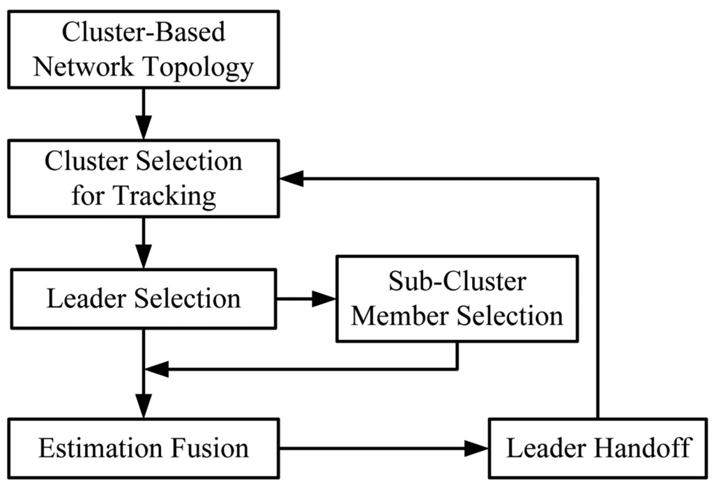 The first perspective is to build up an energy-balanced tracking network architecture. In this work, the concept of leader-based information processing is conducted to automatically achieve cooperative sensor scheduling with multiple tasking sensors in a cluster-based network topology based on sensor residual energy level, target information, and estimation quality. To avoid the ambiguity, the clusterhead and the cluster members refer to the original network topology, whereas the leader and the sub-cluster members refer to the sensor group for the tracking task. Random timers and local criteria are used to determine the tracking responsibility of the clusters. Afterwards, a sub-cluster of the corresponding cluster for the tracking task is formed by a leader, which can be a clusterhead or a cluster member in the original cluster-based network. The second perspective is to explore the behaviors/characteristics of a target such that supplementary information can be applied to improve estimation accuracy. Within the sub-cluster, the sensing nodes provide their measurements to the leader. Upon receiving the measurements, the leader fuses the local estimates from the sub-cluster members and reports it to the clusterhead. When the target moves out the region of the current active sub-cluster, the leader needs to trigger the leader handoff procedure (detailed in Section 3.4).