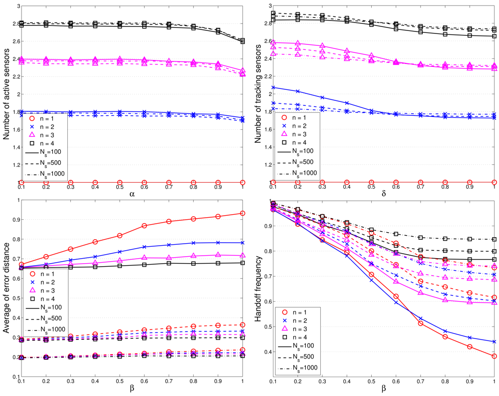 Figure 10 depicts the system performance (e.g., the average positioning error and the leader handoff frequency) with various values of parameters (α, β, δ, sub-cluster size, and network density), for cooperative target tracking. Observe that for parameter β, there is a tradeoff between localization error and leader handoff frequency since a larger value of β (i.e., a larger handoff threshold value) may lead to a lower leader handoff frequency and may result in a lower positioning accuracy. Without loss of generality, we investigate the typical performance of the TCAT in a network with random uniform deployment of NS sensors given α = β = δ = 0.5, C = D = 1, and the standard deviation of angle information σθ = 0.5 radian. Note that the entire experiments are conducted in a square with side length L = 30 unit length and transmission range [35].