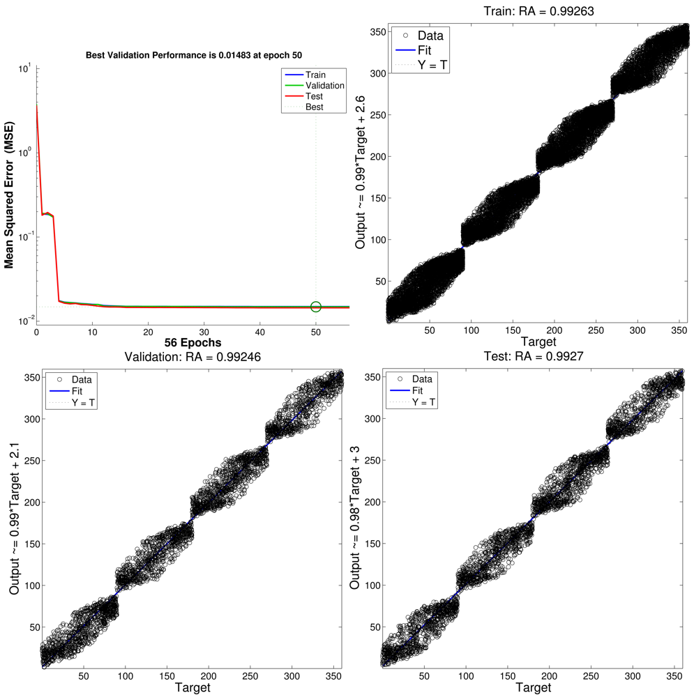 For the CFBP model, Figure 11 depicts the learning and regression analysis of the network. Figure 11 (top left) shows that the network is learning since the mean squared error of the network is decreasing to a smaller value and the training of CFBP network is stopped before overfitting. The 22,804 input and target vectors are randomly divided into three sets. 15,962 vectors are used to train the network. Of these vectors, 3,421 are used to validate how well the network generalized. Finally, the last 3,421 vectors provide an independent test of network generalization to data that the network has never seen. Moreover, regression analysis is employed as post-training analysis between the network response and the corresponding targets and three parameters are returned to evaluate the performance. The first two parameters, slope and y-intercept of the best linear regression relate targets to network outputs. If the outputs exactly equal to targets, the slope and y-intercept would be 1 and 0, respectively. For the training case, slope = 0.99 and y-intercept = 2.6. For the validation case, slope = 0.99 and y-intercept = 2.1. For the test case, slope = 0.98 and y-intercept = 3. The third parameter is correlation coefficient between the outputs and targets. When the correlation coefficient is equal to 1, then there is perfect correlation between targets and outputs. In this study, the correlation coefficients of the regression analysis is about RA = 0.99 as shown in Figure 11, which therefore illustrates a good fit.