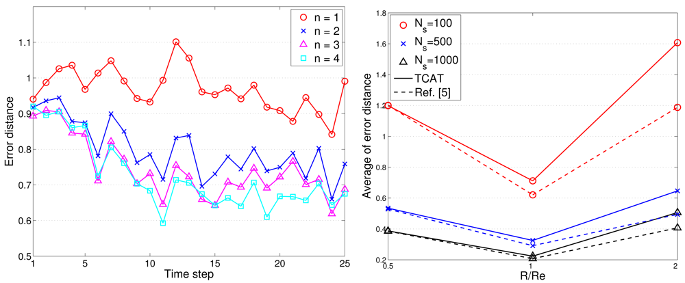 To assess the tracking accuracy, the root mean square error is used for comparing the tracking accuracy of the distributed TCAT with that of [5]. Referring to the network topology and the target movement in Figure 2(left), we vary the number of sub-cluster members from 1 to 4. Figure 12(left) shows the accuracy of the position estimate. The performance improves along with the number of sub-cluster size n. However, the improvement is not significant (especially when the number n is greater than 2). This suggests that even a low number of sub-cluster members can also achieve good estimation accuracy.