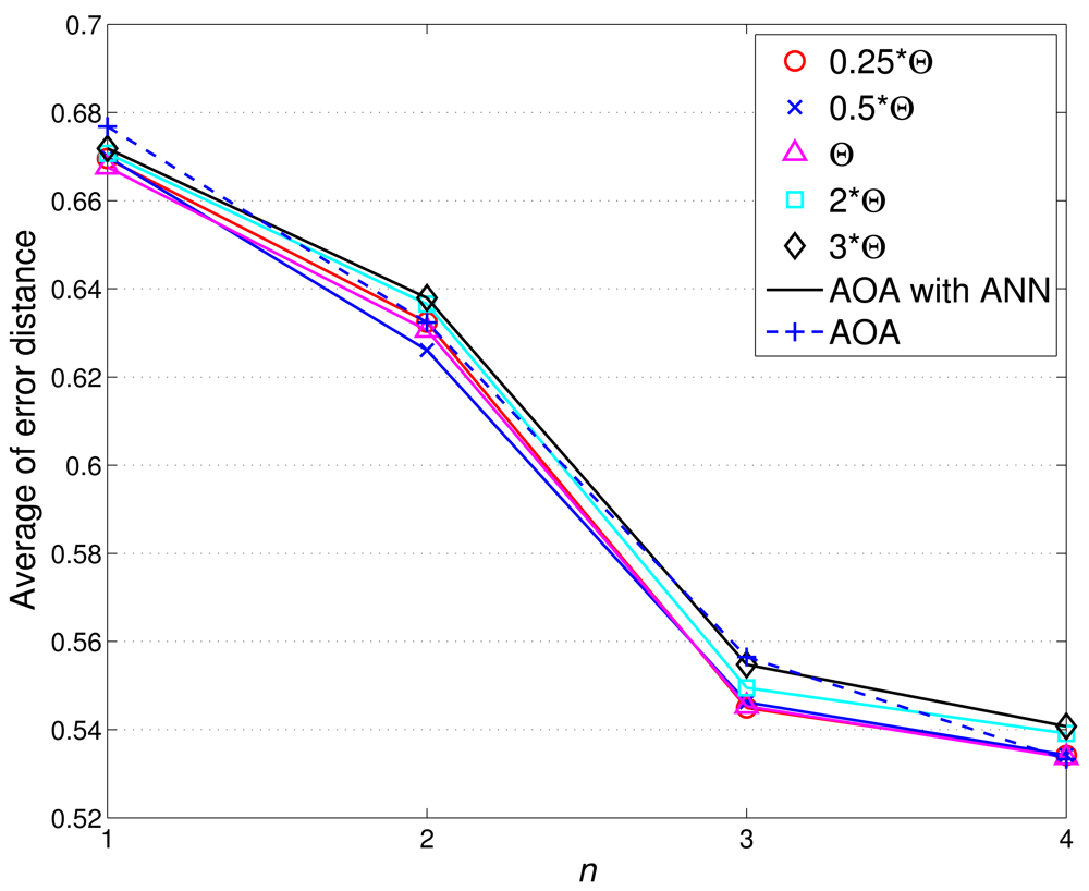 Notice that the above performance evaluation is based on AOA information only without executing estimation refinement. Figure 13 shows the comparison of target localization error with/without ANN refinement. With a moderate value of θth (e.g., 0.25Θ ≤ θth ≤ Θ with Θ = 9.98 degree), the proper refined sample area results in an improvement of estimation accuracy. However, loose NN-based angle information (e.g., Θ ≤ θth ≤ 3Θ) may generate a broader sample area, which degrades the estimation performance.