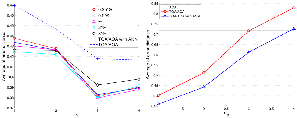 Compared with Figure 13, Figure 14(left) shows that the average localization error is significantly suppressed by applying the TOA information. Considering n = 2 and θth = 9.98 degree, the average localization error of TCAT using AOA/TOA information with ANN refinement is about 36% less than that of TCAT using AOA information with ANN refinement. Nonetheless, as the deviation of TOA measurement increases, the localization performance of TCAT with joint TOA/AOA is approaching to that of TCAT with AOA only (Figure 14(right)). This is attributed to the fact that a noisy TOA measurement may lead to a broader sample area (i.e., a lower particle density) for Bayesian filtering, which enlarges the localization error.
