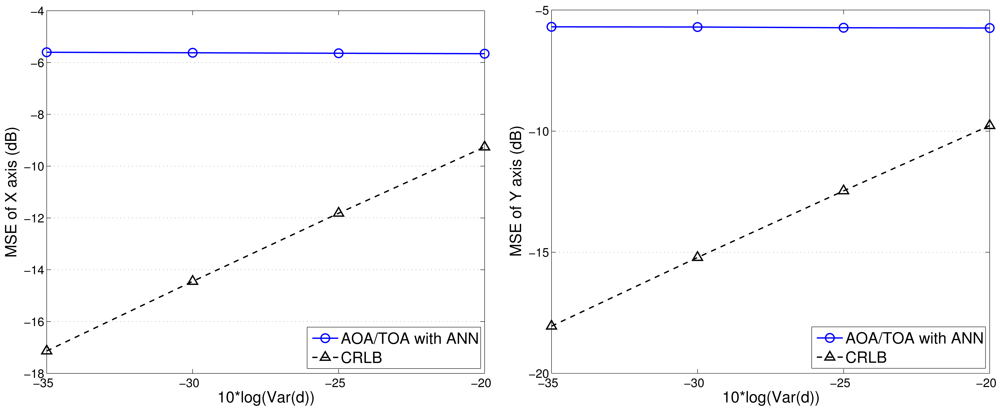 Referring to [30], evaluating the computation process and the significance of approximate accuracy is an important step in deriving either exact or approximate solutions for the localization problem. This section presents an estimation-theoretic analysis of the proposed measurement mechanisms to assess the achievable localization accuracy with Cramer–Rao lower bound (CRLB) for joint TOA/AOA estimation.