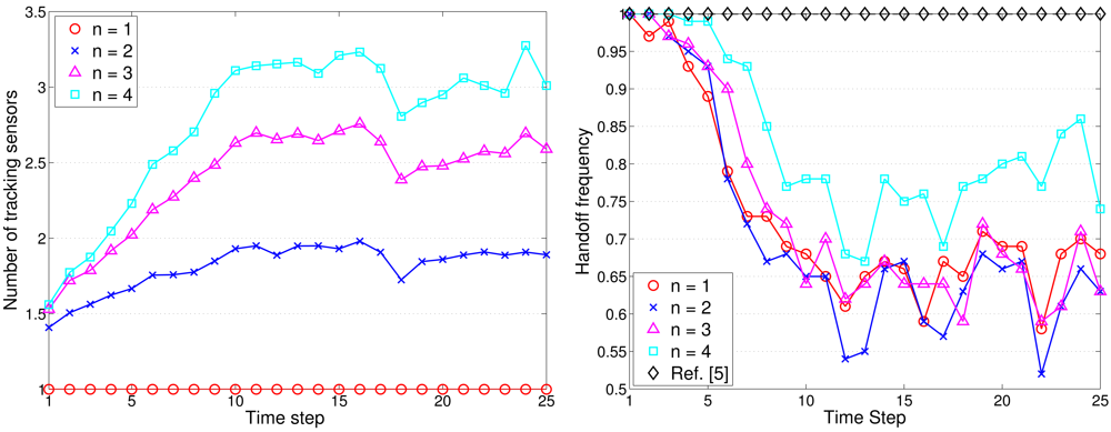 In [12], an information-driven approach in ad hoc sensor networks is proposed to determine the tasking sensors in a “sensor collaboration” by dynamically optimizing the information utility of data for a given cost of communication and computation. In [13], a distributed estimation method is proposed based on mobile agent (MA) computing paradigm and generic sequential Bayesian filtering for the target state estimation at each time step. Nonetheless, the MA migration planning problem needs to be handled in order to achieve the desired tracking accuracy. The tracking schemes in [14,15] combine the mechanisms of the tree-based and cluster-based schemes and propose information-based target tracking methods. However, the proposed sensor systems still have to deal with complexity issues. Authors in [16–21] propose multi-sensor scheduling schemes for maneuvering target tracking in sensor networks, while not considering the motion information of the target. Williams, et al. [22] presents an integrated approach to dynamically routing measurements and models in a sensor network and examines the problem of tracking objects within a region wherein the responsibility for combining measurements and updating a posterior state distribution is assigned to a single sensor at any given time step. The proposed approach is able to substantially reduce the communications cost incurred in tracking an object. However, this strength comes along with the additional complexity of transmitting the representation of the state distribution between the tasking sensors. Comprehensive surveys of design challenges and recently proposed target tracking algorithms can be found in [1].