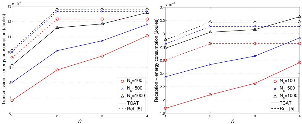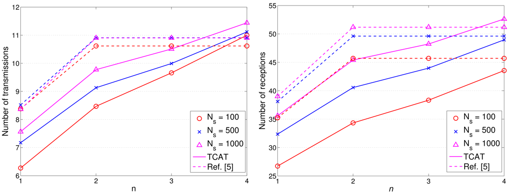 Figures 17 and 18 show the accumulated energy consumption comparison between the TCAT scheme and the method in [5]. Observe that the number of transmissions/receptions grows nearly linearly as the tracking sub-cluster size increases. Referring to Figure 17, compared with a network with NS = 100 and 1 ≤ n ≤ 3, a network with a larger scale (e.g., NS = 500, 1000) may have a larger cluster size, which may lead to a higher number of transmission/reception for data gathering at each round and result in a faster network resource depletion. Nonetheless, the performance of TCAT is still superior to that of the approach in [5].
