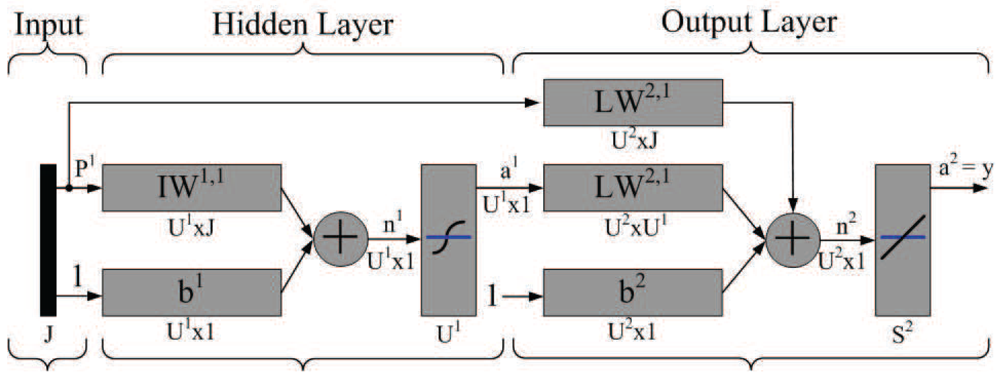 Assume that the network under consideration has a general architecture with three layers of neurons. In our case, input and output layer neurons are linear, whereas neurons in the hidden layer are tan-sigmoidal. Let the vector pairs in