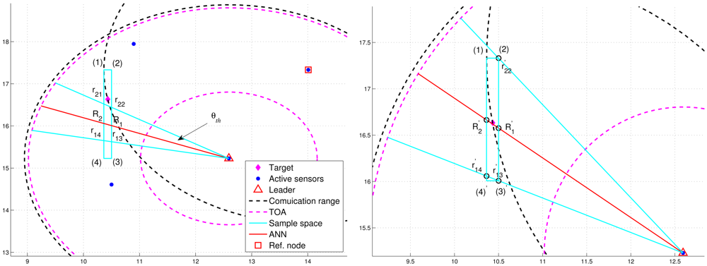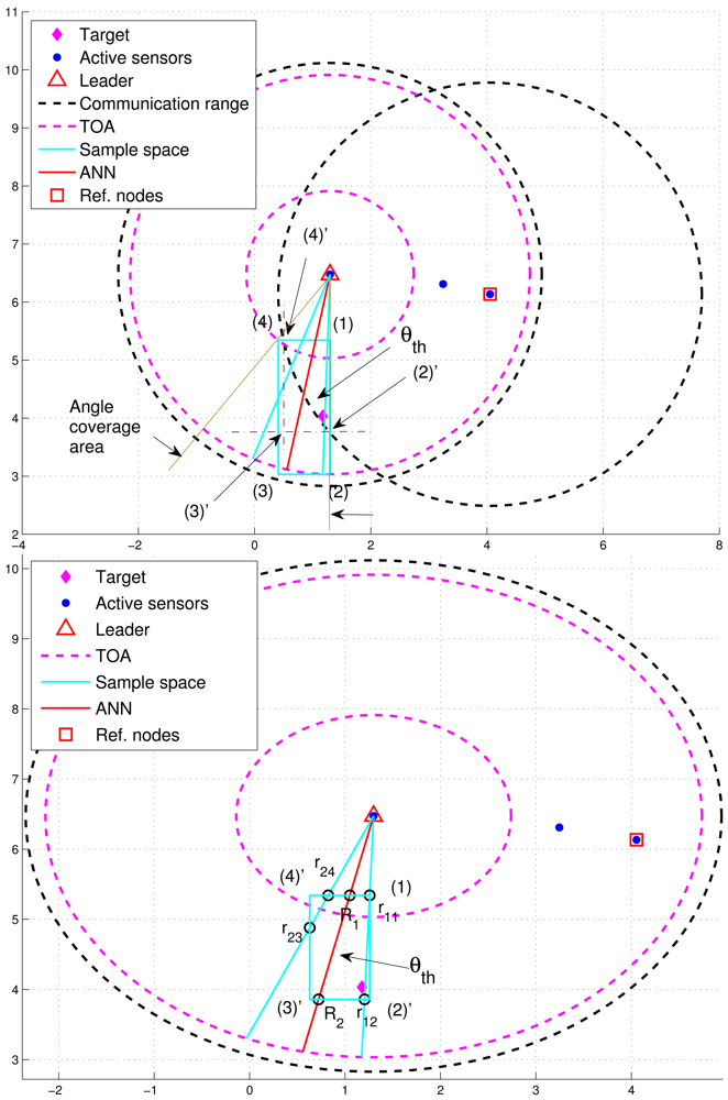 In general, the localization problem can be solved by the joint time-of-arrival (TOA)/angle-of-arrival (AOA) positioning scheme using a single seed (i.e., a sensor node with a known position). However, in the case of poor observations, more TOA/AOA measurements (i.e., multiple tasking sensors) may be applied to complement the measurements of the environment.