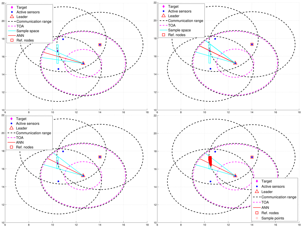 Since the AOA measurement quality highly depends on the communication environment, this subsection presents estimation refinement criteria based on noisy AOA information, TOA information, and an angle-of-arrival neural networking (ANN) model. The purpose of the ANN model is to coordinate the initial target position estimate, the initial sample space, and the measurement information in a scenario with multiple tasking sensors such that effectively adjustment of angle information and a better sample area for particle filtering can be provided.