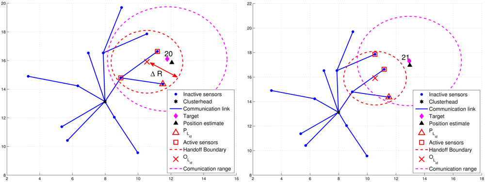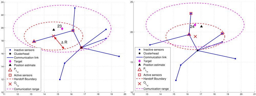 Figure 8 presents an example of adaptively updating the sub-cluster members with ΔR. Observe that at time step 20, two sub-cluster members are with tracking responsibility (Figure 8(left)). However, at time step 21, one sub-cluster member becomes an inactive sensor due to the target movement (Figure 8(right)). Thus, the leader will assign an active sensor which is located inside BLid to become a new sub-cluster member. If any of the above conditions holds, the leader and target will sequentially broadcast a Handoff message with Lid = 0 to trigger a leader reselection process as depicted in Phases I and II. Figure 9 shows an example of leader handoff procedure from time step 23 to time step 24. In Figure 9(left), a handoff procedure is triggered by condition 2. Afterwards, as shown in Figure 9(right), a new leader and its associated sub-cluster members are formed.