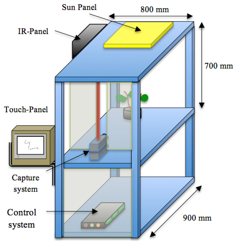 We have developed a growth chamber to study growth in a 24 h continuous fashion. It is constructed of removable panels of aluminium integrating an artificial vision system. The corresponding vision system comprises an image capture device, an illumination system and an image-processing unit. We designed the growth chamber with a reconfigurable structure to accommodate plants of different sizes. It has an inner volume of 300 × 300 × 700 mm, and an external size of 800 × 900 × 700 mm.