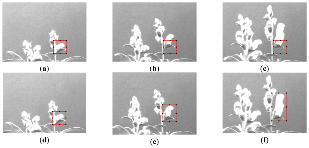 Figure 10(a,b,c) show a sequence of three images of Antirrhinum flowers taken 24 h apart where the originally fixed ROI is not capable of obtaining the image characteristics as growth has displaced its position. Figure 10(d,e,f) show the same sequence, where the displacement and size increment of the ROI allow the correct acquisition of the object parameters.