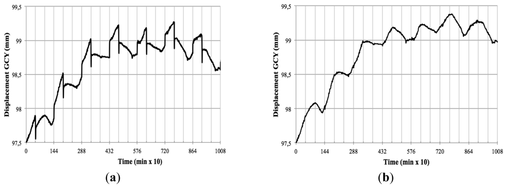Figure 12(b) shows the results obtained after applying the correction algorithm on the Y displacement of the centre of gravity of an Opuntia cladode for a complete experiment comprising 7 days at an acquisition rate of 60 images per hour.