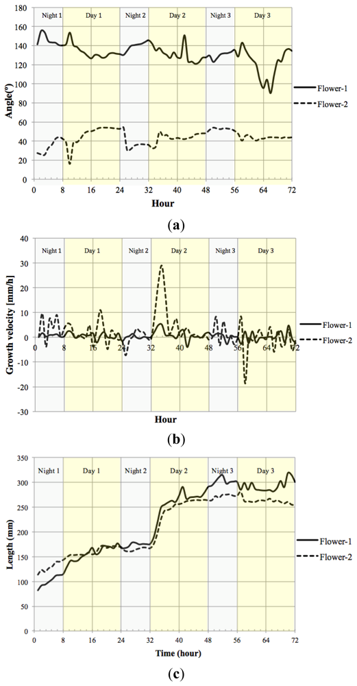 Plant growth follows a rhythmic pattern that is apparently influenced by the photosynthetic physiology i.e., C3-based photosynthesis and Crassulacean Acid Metabolism (CAM) plants display different patterns [17], and monocots and dicots also show differences in the way continuous light and temperature affects diel leaf growth [18]. Most leaves and stems of dicotyledonous plants grow during the so-called subjective night [19,20], but knowledge in the development of other organs like flowers is basically missing. Furthermore the rhythmic movement of plant organs known as nutation makes it challenging to obtain quality data to measure and quantify both nutation and growth.