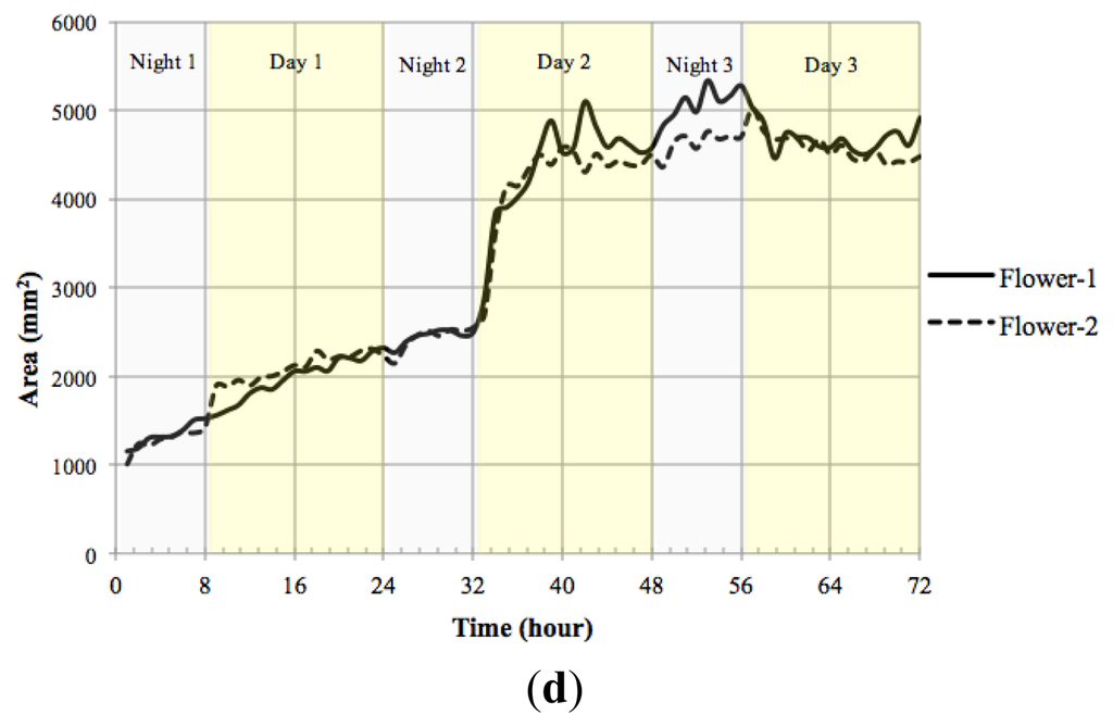 We calculated the velocity of growth for time zero till time 72 h Figure 13(b). Although total floral length and area do not decrease throughout the stages analyzed, the corresponding relative growth speed was sometimes negative indicating that the flowers had modified their position towards the camera.