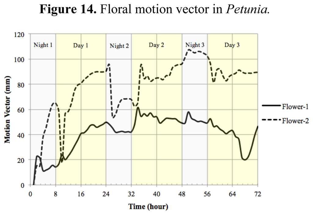 The motion vector—a measurement of nutation—showed a sharp change shortly after dawn (Figure 14). As flowers matured and the limb expanded to its full size, the motion vector showed a lower activity. We calculated the absolute movement covered by the flowers as a function of age and found that throughout development there was a quick movement of the GC of the flower shortly after dawn (Figure 14). In contrast to floral length and area that showed a single strong increase in size at dawn and early morning, the MV of the flowers presented a progressive dampening, as young flowers had larger changes than mature flowers. All above measures have been obtained with a resolution of one image every 10 min for a 3 days period.