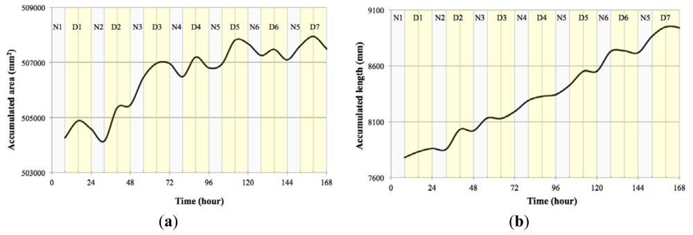 In order to test our system with a plant of a different structure, we analysed growth of cladodes of the prickly pear Opuntia ficus-indica. We introduced plants in the growth chamber for a period of 7 days with a photoperiod of 16 h light and 8 h dark. The measurement resolution was of one image every 10 min and the amount of data gathered was 1,008 per variable measured.