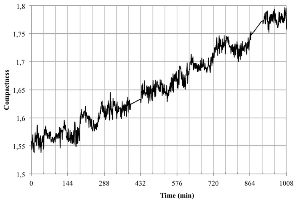 Converting the data obtained to accumulated area and length (Figure 15) showed that indeed Opuntia cladodes show a rhythmic pattern, however the growth pattern did not adjust to a diel pattern. In fact we uncovered that the accumulated area and length did not directly match as there were certain measured times that registered growth in length but not in area (Table 3). This decoupling of proximo-distal versus lateral axis growth coincides with the current genetic model of leaf area as two independent sets of genes controlling these processes. However the cladode is not a true leaf, but a modified stem. Thus the data obtained with the system developed allows the development of testable hypothesis about the genetic and environmental control of growth in cladodes that should share components with the leaves. Looking at the compactness of the cladodes (Figure 16) we also could confirm the previous assumption as during growth, compactness departed from a perfect circle that would be represented by a value of 1.
