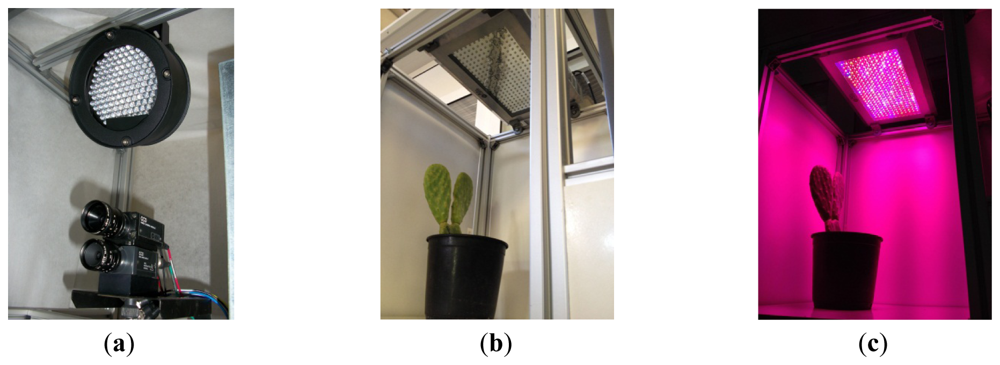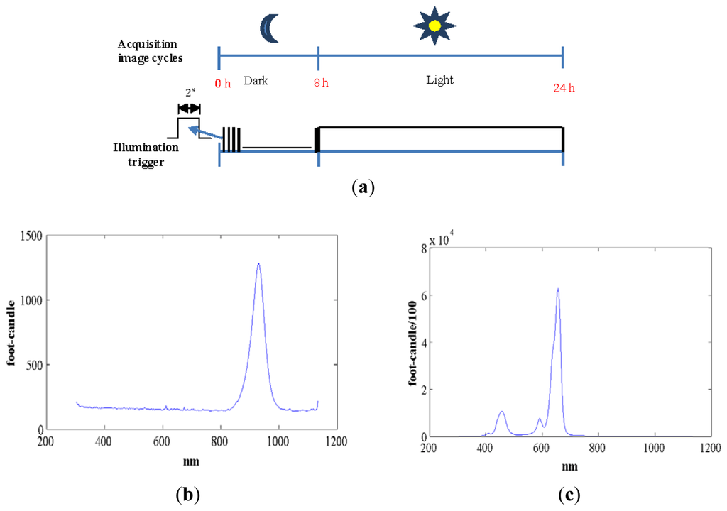 We used standard agriculture illumination designed for growth improvement. It comprises two panels based on Light-Emitting Diode (LED) technology that provide light at different wavelengths according to a day/night period scheme that is reproduced inside the chamber. The panel emitting visible light is made up of an array of 48 LEDs, combining different wavelengths (see Figure 3(c)). This reproduces the wavelengths necessary to activate photosystem I and II ensuring a proper vegetative and reproductive growth of the plants. Indeed there are at least four types of photoreceptors that play a role in light signalling as inputs during plant development [21]. These include UV-light receptors, red-light, far-red light and at least two additional that have not been characterized in terms of absorption wavelength. The night panel is formed by an array of LEDs with a wavelength of 948 nm (see Figure 3(b)). The far-red light wavelengths were switched on during the dark signalling capture for a few seconds. Nevertheless, far-red light does not interfere with the subjective night and is extensively used in night imaging of photoperiod sensitive experiments [22]. Figure 3(a,b) show light spectra (wavelength vs. light intensity). IR peaks for day and night lighting systems do not match because during the night period spectrum must be far-red to avoid any interference in plant's growth.Figure 3(a) shows how the light system is activated and deactivated in the day/night periods of 16 h/8 h. During the night period, the control system activates the night panel for a period of 2 s, enough time for the night-camera to integrate the image without interfering with plant performance or morphogenesis. During the day period, the day panel remains active providing the radiation to allow proper development.