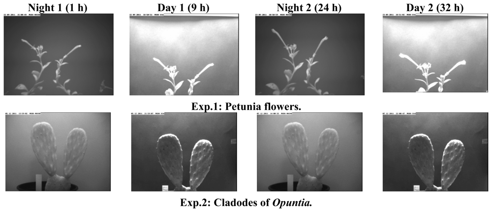 Figure 4 shows images of two species used to set up the system, petunia flowers and cladodes of the prickly pear cactus Opuntia ficus-indica. The first experiment was performed with petunia flowers for a period of 3 days whereas the second experiment was performed using cladodes of Opuntia for a period of 15 days.