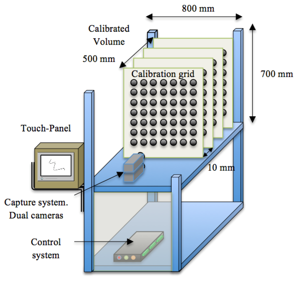 In order to calibrate the capture system [24] we used a grid of 100 circles distributed in ten columns and ten rows. Each circle had a radius of 5 mm, and separation between circles was 10 mm. The volume of the growth chamber used for image capture was divided into 50 planes separated 10 mm from each other and perpendicular to the plane of the camera (Figure 5). Each camera was calibrated for each of the planes. The calibration information, together with the distance between the cameras and the plane of calibration are stored in the image processing system. Before starting the image capture process, the image capture module requests to input by the user the distance of the sample in order to calibrate the system.