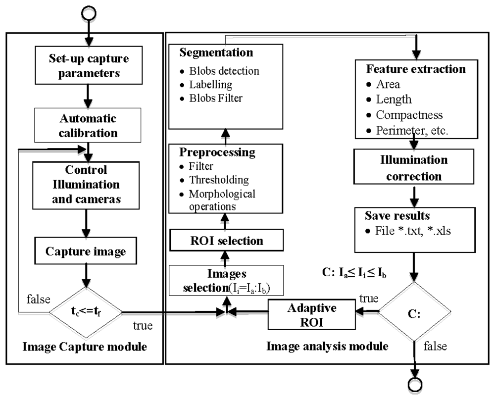 The module allows the application of a reconfigurable set of image processing algorithms in an iterative fashion over a set of images corresponding to one experiment. The results obtained are exported by the software module as *.xls or *.txt for representation and interpretation. Figure 6 shows a flowchart of image capture and image analysis modules.