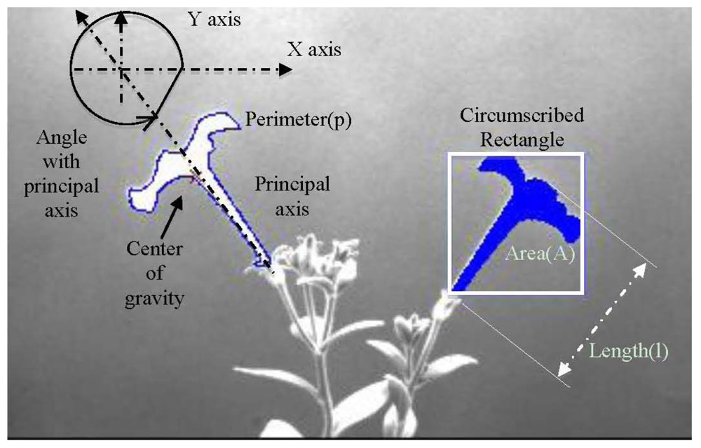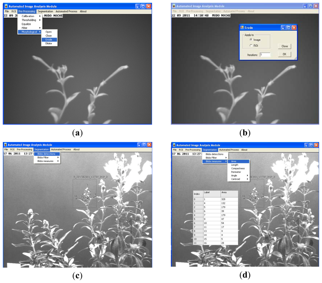 In order to increase the flexibility of the image analysis module, and use it in different experimental set-ups, the user can configure the preprocessing, segmentation and feature extraction. Preprocessing can be configured by the user using different (up to four) filtering (average, median, Laplacian, sharpen, custom mask: 3 × 3, 5 × 5 or 7 × 7) or morphologic (dilation, erosion, opening and closing) operations [25]. Edge detectors (Robert border operator, Sobel border operator, etc.) are used in those circumstances where plants organs show kinky aspect. Segmentation can be configured by the user using several algorithms including thresholding (Otsu [26], Kapur [27] or Kittler [28]), blobs detection and blobs filtering by minimal and maximal values of area, compactness, length and perimeter. These can be applied in a sequential manner and in the order decided by the user.The feature extraction stage can also be configured to determine characteristics of segmented organs like number, labelling, area, length, centre of gravity, compactness, perimeter, angle of the principal axis, and register these values.