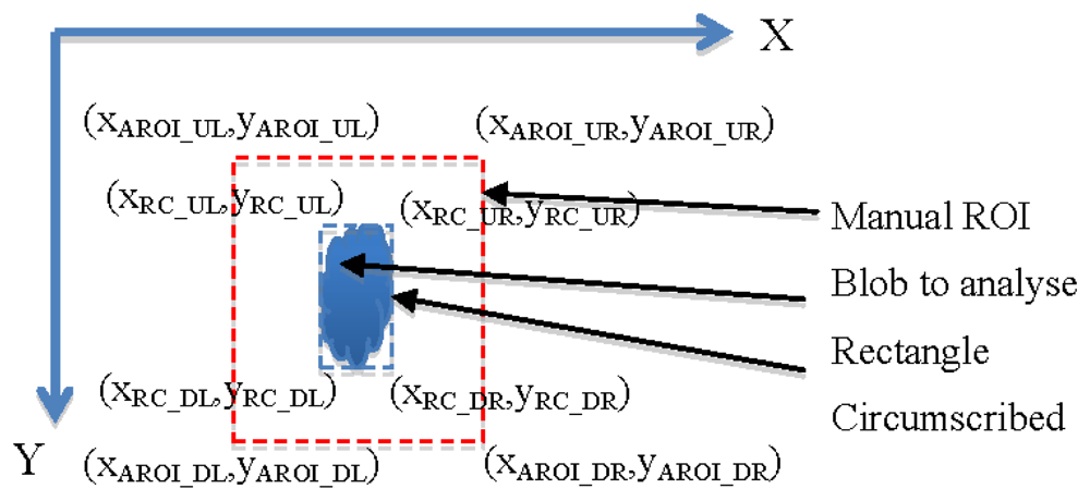 For every new image the AROI is calculated. It maintains a constant distance with the vertices of the rectangle containing the blob (see Figure 9). Calculations are done according to expressions on Table 2. The constants MGX and MGY correspond to the maximum growth rate per unit of time in the direction of the X or Y axis and RC being the rectangle circumscribed.