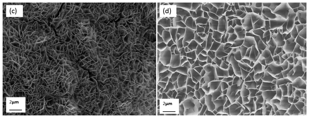 The grown honeycomb-like nanostructures were characterised by FESEM, HRTEM, and XRD techniques. In Figure 1(a–d), low magnification FESEM images of the honeycomb-like nanostructures of NiO are shown, which demonstrated the attachment of NiO thin films on the nickel foam substrate. The honeycomb-like NiO nanostructures were clearly seen at high FESEM magnification and from this it can be seen that the grown NiO nanostructures are highly uniform and dense.