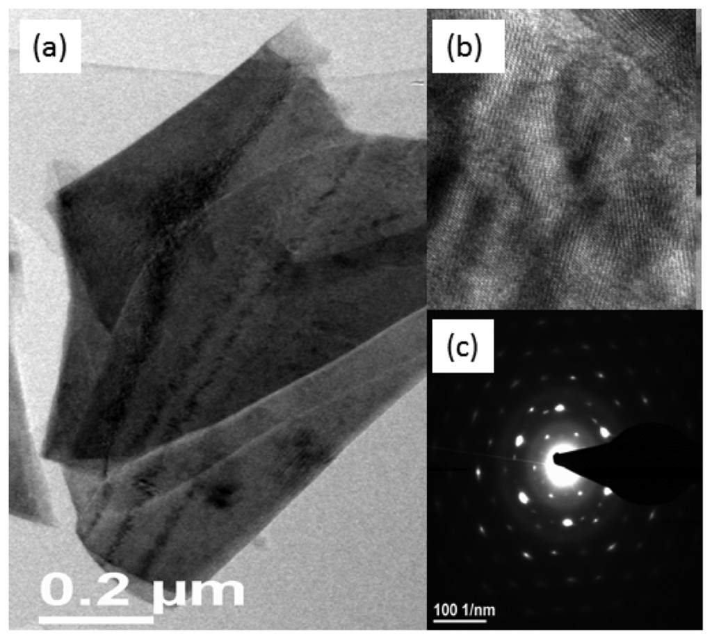 The transmission electron microscopy study revealed that the NiO honeycomb nanostructures possessed face centred cubic crystallinity with a space lattice of 0.21 nm for the (002) crystal plane of NiO, as shown in Figure 3(a). In the selected area electron diffraction pattern (SAED, Figure 3(b)), it has been observed the results are almost consistent with the XRD patterns; therefore the honeycomb-like nanostructures of NiO are cubic in crystallinity with the presence of rings in the nanostructures described the nanoflakes nature of NiO as shown in Figure 3(c). The crystal size of NiO was calculated by XRD using Scherer's equation for 200 crystal plane and the obtained value for the crystal size is 62 Å.
