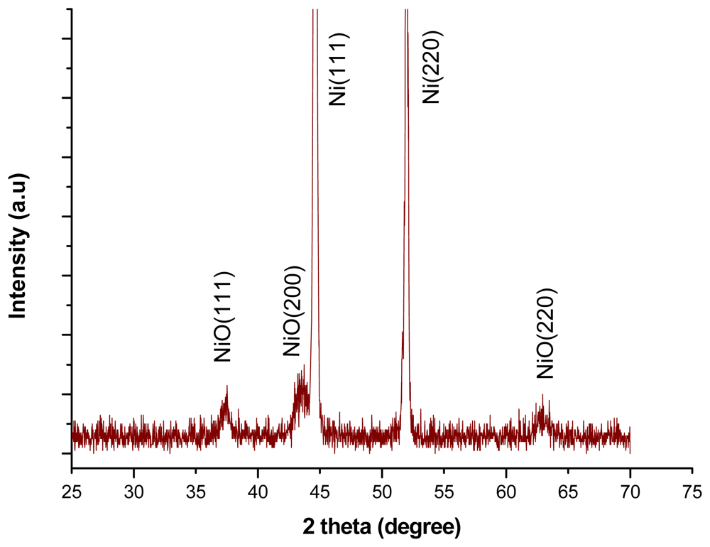 The x-ray diffraction study showed that the nickel oxide honeycomb nanostructures exhibited a face centred cubic phase crystalline structure as shown in Figure 2 and the pattern of XRD is supported by literature data (JCPDS NO. 47-1049).