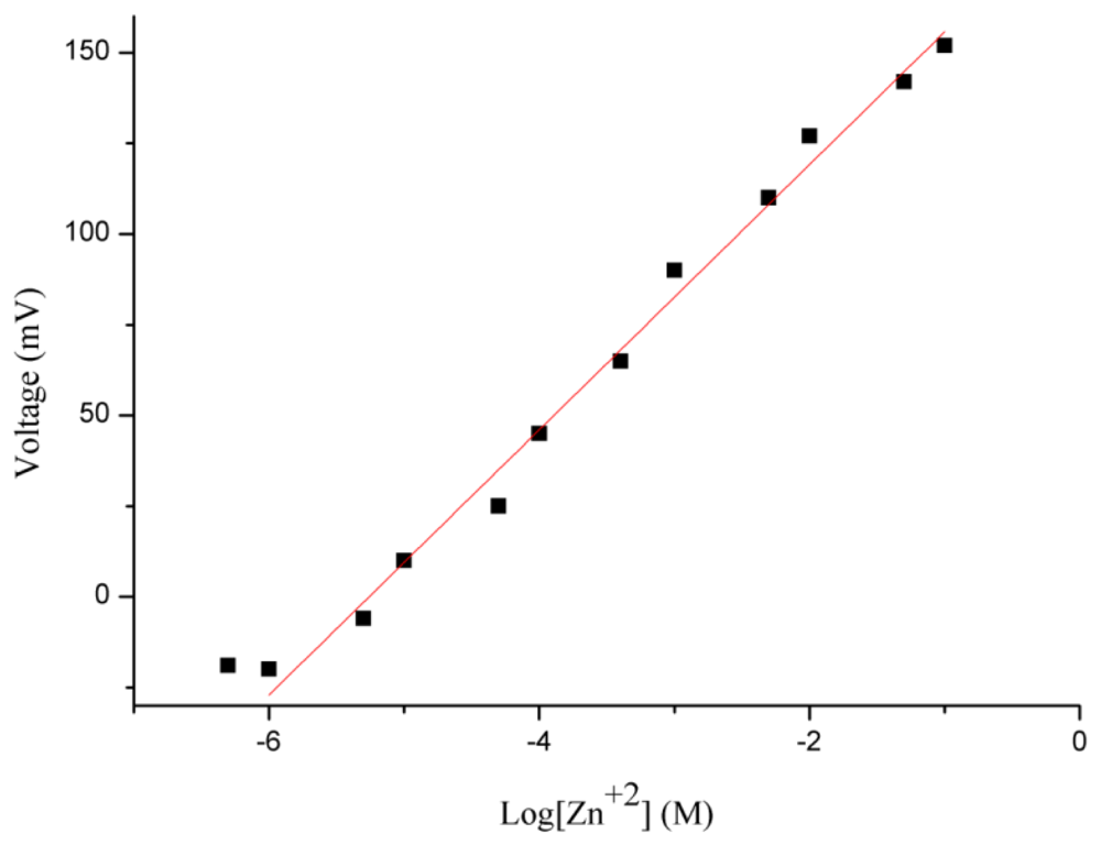 A sensitivity of 36 mV/decade for the functionalised NiO nanostructures-based zinc ion sensor was observed, with a regression coefficient of r2 = 0.99. This is due to the high surface provided by the honeycomb-like nanostructures for the attachment of the selective zinc ion ionophore and due to shortened diffusion path in the solid phase of the NiO nanostructures which might be responsible for the slightly higher slope value than the theoretical value. These two characteristics of the proposed sensor electrode confirmed its potential applicability for analytical purposes.