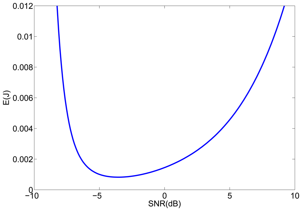 On the other hand, note that the desired accuracy imposed a relationship between snr and T, thus, there is an optimum value of T corresponding to snr*, which can be calculated from Equations (1) and (4):