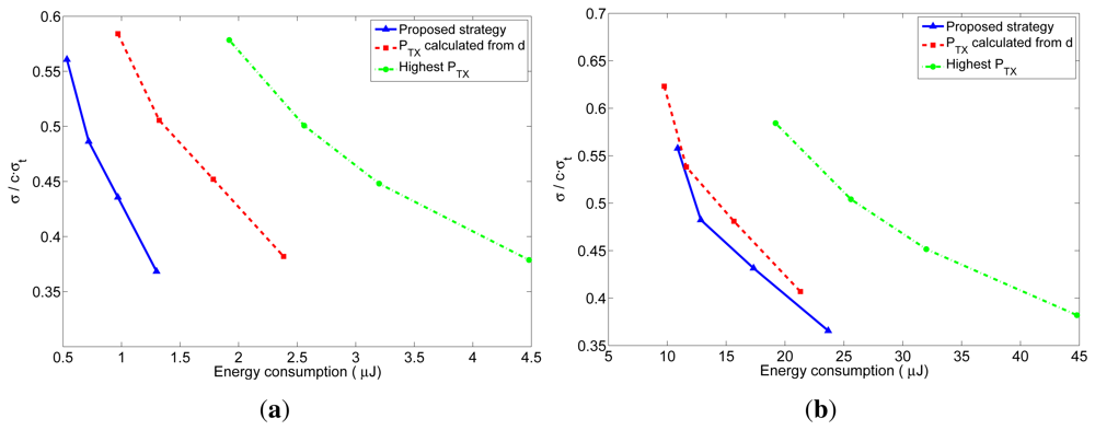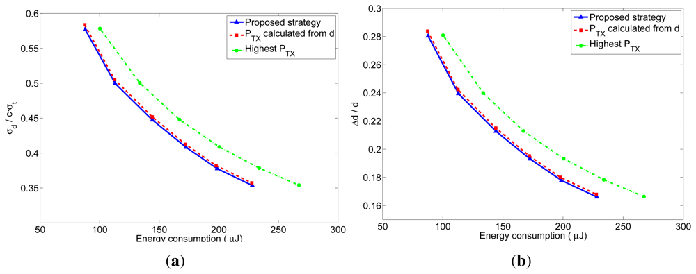 Finally, we would like to point out that in practice, the synchronization of the network may not be perfect. In this case, the nodes should be listening to possible transmissions also during the idle periods in order not to lose packets, so the energy consumption in reception mode would increase. The proposed strategy is not directly affected, as it optimizes the energy consumption in transmission mode, but the energy savings, relative to the total energy consumption, would not be as high as in the ideal synchronization case. Another effect of an imperfect synchronization is that TOA measurements will not be so accurate, so its standard deviation will increase and the distance estimation errors will be higher. This does not affect the performance of the proposed strategy, as it was formulated in terms of the desired number of packets. But clearly, the desired number of packets to achieve a certain accuracy will increase with respect to the ideal case (see Equation (25) in Appendix A: if σt increases, n has to increase to achieve the same σ), and the energy consumption will increase accordingly.