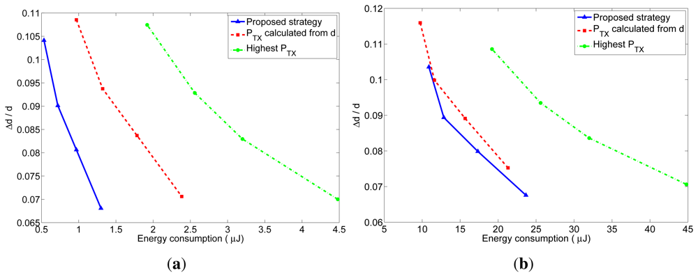 The trade-off between the energy consumption and the accuracy of localization algorithms was first addressed in [19], which proposed a localization algorithm in which each node can choose between different methods to measure the distances to their neighbors, each one with different accuracy and different energy consumption. This algorithm enables to know the amount of energy needed to obtain a given accuracy, or the accuracy that is achieved with a given energy consumption. As mentioned in Section 1, in wireless ad hoc and sensor networks distances are usually estimated from some parameter of the radio signal, as the RSS or the TOA. In practice, in a given network, only one of these parameters is used to estimate the distances between the nodes, so in order to reduce energy consumption, it would be valuable to find a transmission strategy that minimizes the energy consumption for a given accuracy and for a given distance estimation technique.