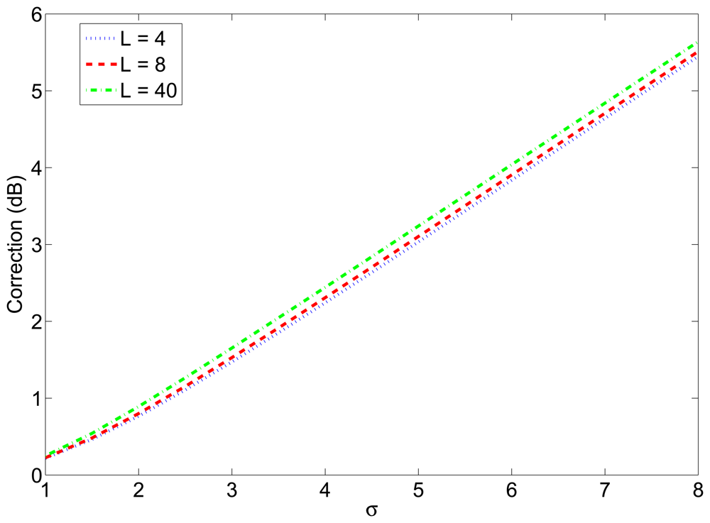 As a consequence, the estimated transmission power has to be corrected by adding a margin equal to the mean value of Equation (13). In other words, this margin must be calculated as the difference between the mean value of the SNR of the successfully received packets (which can be calculated numerically using Equation (14)) and SNR*. Figure 2 shows the value of this margin as a function of the standard deviation of the shadowing for different packet lengths. This margin was seen to be independent of the value of W/vb, and nearly independent of the packet length, as it can be seen in the figure.