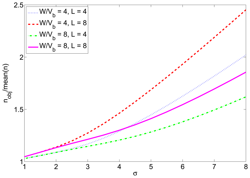 Figure 6 shows the probability density function of the relative number of received packets (n/nobj) for TOA-based and RSS-based localization. The different curves correspond to different values of σ/d and σ respectively, and were calculated for a packet length of l = 5 bytes (different packet lengths produce similar results, but a little more sharper as the packet length increases). In both cases, when the standard deviation is bigger, the probability of not receiving the desired number of packets is higher. It can be also seen that if the standard deviation is over a certain threshold, the pdf begins to be bimodal. This is because the margin of SNR for which the PRP takes intermediate values is small, so if the standard deviation is big enough, the probability of receiving packets with a very low or very high SNR (enough to make PRP = 0 or PRP = 1 respectively) is significant.