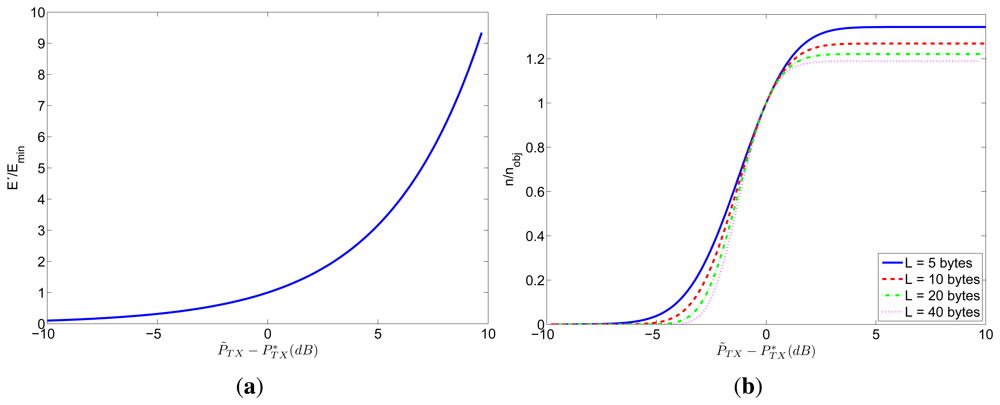 Figure 4 shows how the errors in the transmission power affect the consumed energy and the number of received packets. In particular, Figure 4(a) represents the ratio between the energy consumption E′ corresponding to the estimated transmission power and Emin (corresponding to the optimum transmission power ) as a function of the error in the transmission power . This relation is valid for any value of nobj, for any W/vb ratio for any packet length l and for any distance between transmitter and receiver. On the other hand, Figure 4(b) shows the relation between the number of received packets n corresponding to the estimated transmission power and the desired number of received packets nobj (corresponding to the optimum transmission power ) as a function of the error in the transmission power. This relation is valid for any value of nobj, for any W/vb ratio and for any distance between transmitter and receiver, but depends on the packet length l.