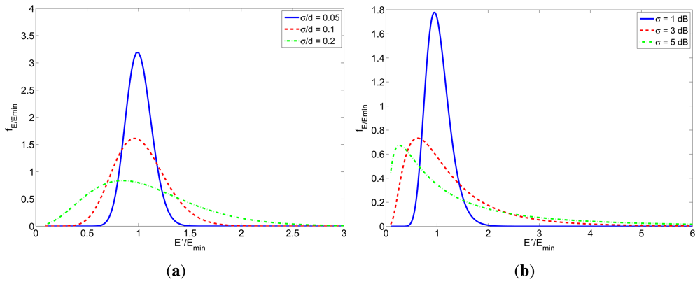 Figure 5 shows the probability density function of the relative energy consumption (E′/Emin) for the cases of TOA-based and RSS-based localization. The different curves correspond to different values of σ/d and σ respectively. Notice that in the TOA case the individual values of σ and d do not have any influence, as long as the relation σ/d remains the same. This can be easily understand from Equation (18). In both cases, the probability of consuming more energy increases with σ. Furthermore, the mean value of E′/Emin also increases when the standard deviation increases.