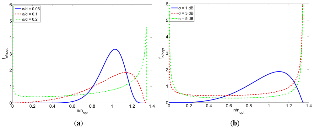 On the other hand, even when the optimum transmission power is used, the final snr at the receiver may not be the desired one, as the propagation is again affected by random shadowing. In fact, the snr at the receiver will be a log-normal random variable and, therefore, the PRP and n will also be random variables and their probability density functions can be calculated easily according to Equations (1) and (4). In particular, the probability density function of the PRP can be calculated as: