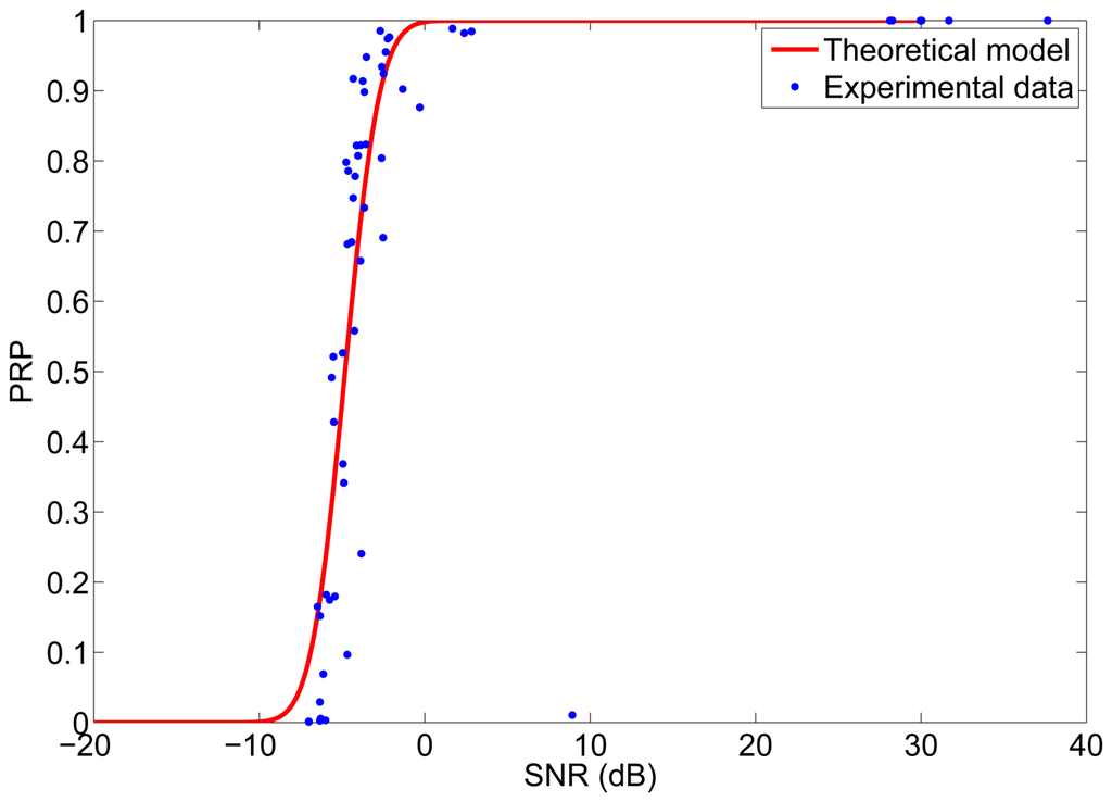 The first set of experiments were carried out to determine the PRP as a function of the snr. These experiments were made with Memsic's MICAz motes. The MICAz is a 2.4 GHz mote with direct sequence spread spectrum radio, which uses an O-QPSK modulation scheme. Two motes were used for the experiments, one as transmitter and one as receiver. The experiments were carried out in a laboratory environment in which there were obstacles and people sitting or walking and interfering signals from other motes and other wireless systems working at the same frequency (WiFi). In each experiment, the transmitter node transmitted a packet of 8 bytes every second and the receiver node measured the RSS of the received packets, from which we obtained the snr at the receiver. The experiment was repeated for different distances between transmitter and receiver and for different transmission powers in order to have different values of snr at the receiver. The experimental results are shown in Figure 7, together with the theoretical model given by Equation (1). As it can be noticed in Figure 7, the experimental data adjust quite well to the model, with the exception of some outliers. From this experiment we obtained a value of NRX = −87 dBm for the noise level at the receiver.