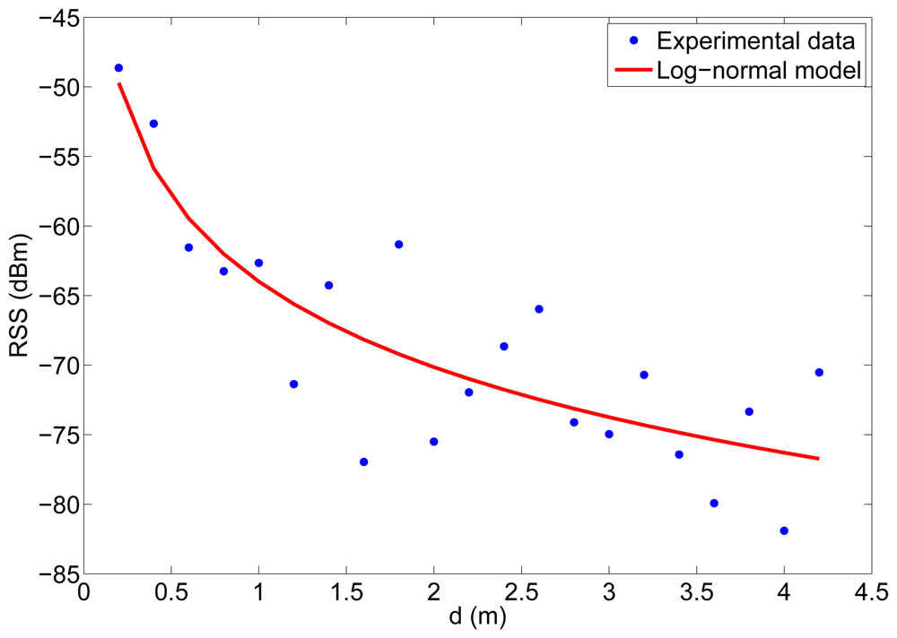We also made some experiments to characterize our radio channel, that is, to establish a relation between transmission and received power in terms of the distance. In these experiments, two MICAz motes were used again, with the same configuration as in the PRP experiments, and the tests were carried out in different rooms. The RSS of the received packets was measured for different distances between transmitter and receiver. At each position, several measurements of RSS were obtained, in order to average their values. In these experiments the transmitter used PTX = 0 dBm. The results from one of the experiments are shown in Figure 8. The curve in Figure 8 represents the fitting of the mean of Equation (2) to these experimental data and was calculated using the Levenberg–Marquardt algorithm, taking d0 = 1 m, PTX = 0 dBm and η and A as free parameters. From this experiment we obtained a value for the path loss exponent and the constant A (η = 2 and A = −64 dB). For other experiments, the estimated values of A were between −60 dB and −70 dB and the estimated values of η were between 2 and 3.