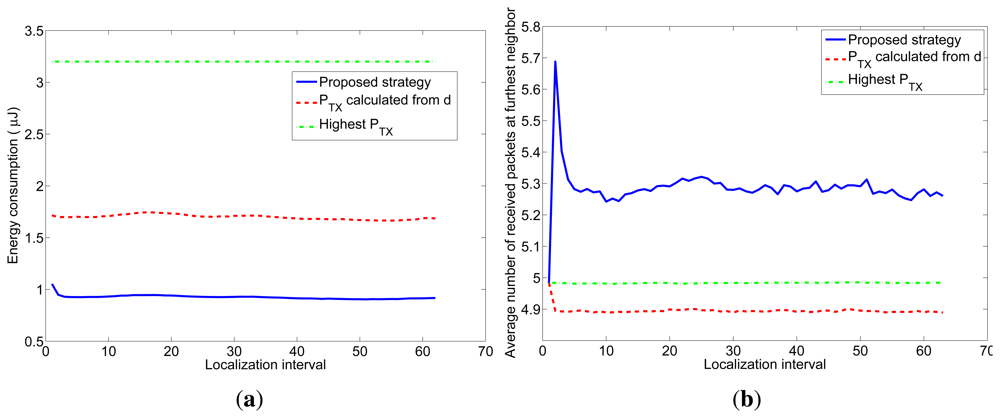 The behavior shown in these figures is valid for both TOA-based and RSS-based localization schemes, but as the probability distribution of the distance estimation is different for the two localization schemes (see Appendix A and B), the probability distribution of will also be different. Therefore, the frequency of underestimations and overestimations of the transmission power will depend on the distance estimation method, and this will affect the probability distribution of the energy consumption and the number of received packets, as we will see next.
