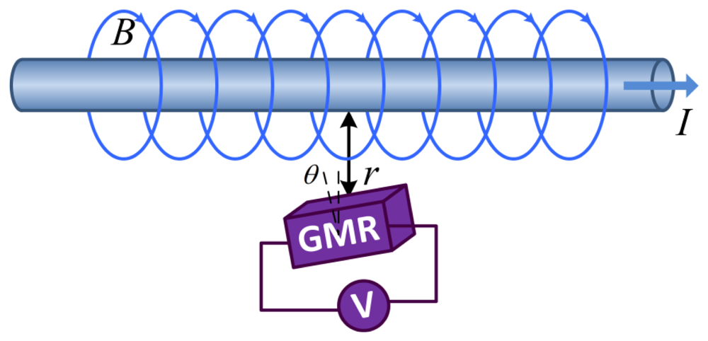 Current flowing through a metal wire creates a magnetic field around the wire. The relationship between the current and magnetic field is described by the Biot-Savart Law. The principle of operation of the GMR current sensor is shown in Figure 1. The current flowing through the metal wire can be measured from the output of the GMR current sensor, when the GMR current sensor is placed close to the wire. The output of the GMR current sensor can be generally described by: