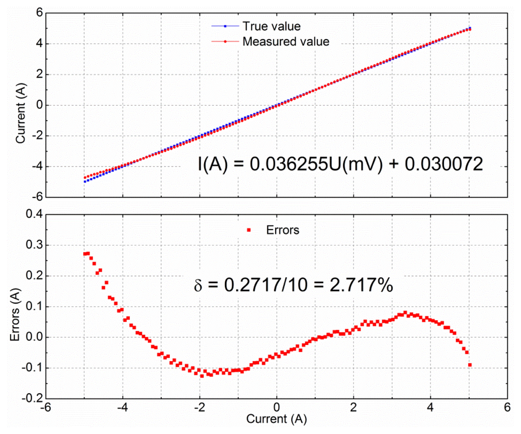 The related coefficients can be adjusted to appropriate values using the differential amplifier unit. Usually, the lower the measured current range, the higher the accuracy and the lower errors. This empirical finding is shown in Table 1. When the measured current range was 0∼±2 A, the linearity increased to 99.993%, and the maximum deviation decreased to 1.757%.