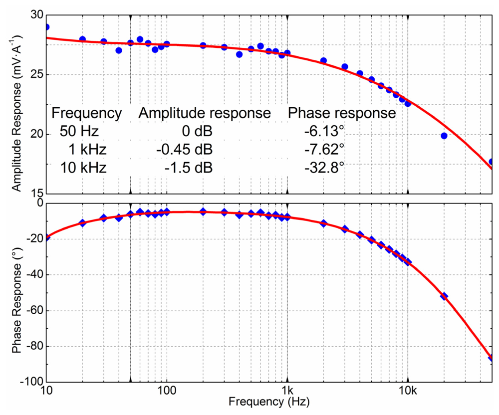 The multilayered GMR chip can sense high frequency magnetic fields up to 1 MHz. By measuring pure sinusoidal current with different frequencies, the frequency response of the sensor was obtained, which is shown in Figure 11. The GMR current sensor worked very stably from 50 Hz to 1 kHz. The amplitude response was 28 mV·A−1, and varied less than 5%, about −0.45 dB at the reference amplitude response of 50 Hz. The phase response lagged by approximately −6° but only varied a little. From 1 kHz to 10 kHz, the amplitude and phase response of the GMR current sensor were gradually attenuated. The amplitude response attenuation was about −1.5 dB at the reference amplitude of 50 Hz, and the phase response lagged from −6° to nearly −33°.