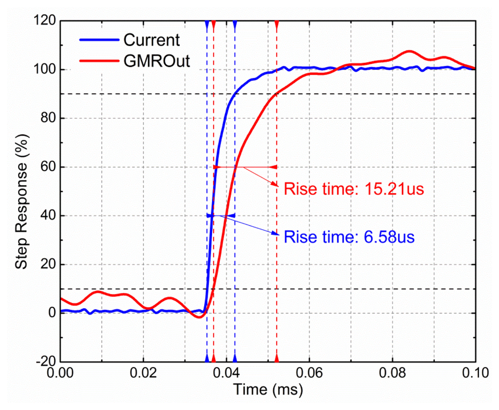 The step response of the GMR current sensor is shown in Figure 12. The step signal was generated by a waveform generator (Agilent 33250A). Measured using a Tektronix TCP312, the rise time of the step current was 6.58 μs, and the rise time of the output voltage of the GMR current sensor in response to the step current was 15.21 μs. It is recognized that an infinitely steep current step is impossible to be realized. Therefore, the rise time of the GMR current sensor is evaluated from the relation: